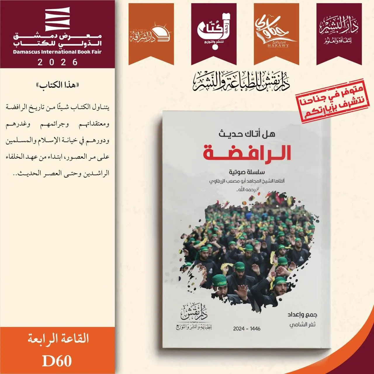 وقال مصدر أمني مطّلع في بيان إن”جهاز المخابرات الوطني العراقي تدخّل بشكل مباشر لدى الجهات المختصة في الحكومة السورية، ما أسفر عن حظر عرض وبيع كتاب (هل أتاك حديث الرافضة) ضمن فعاليات معرض دمشق الدولي للكتاب”.