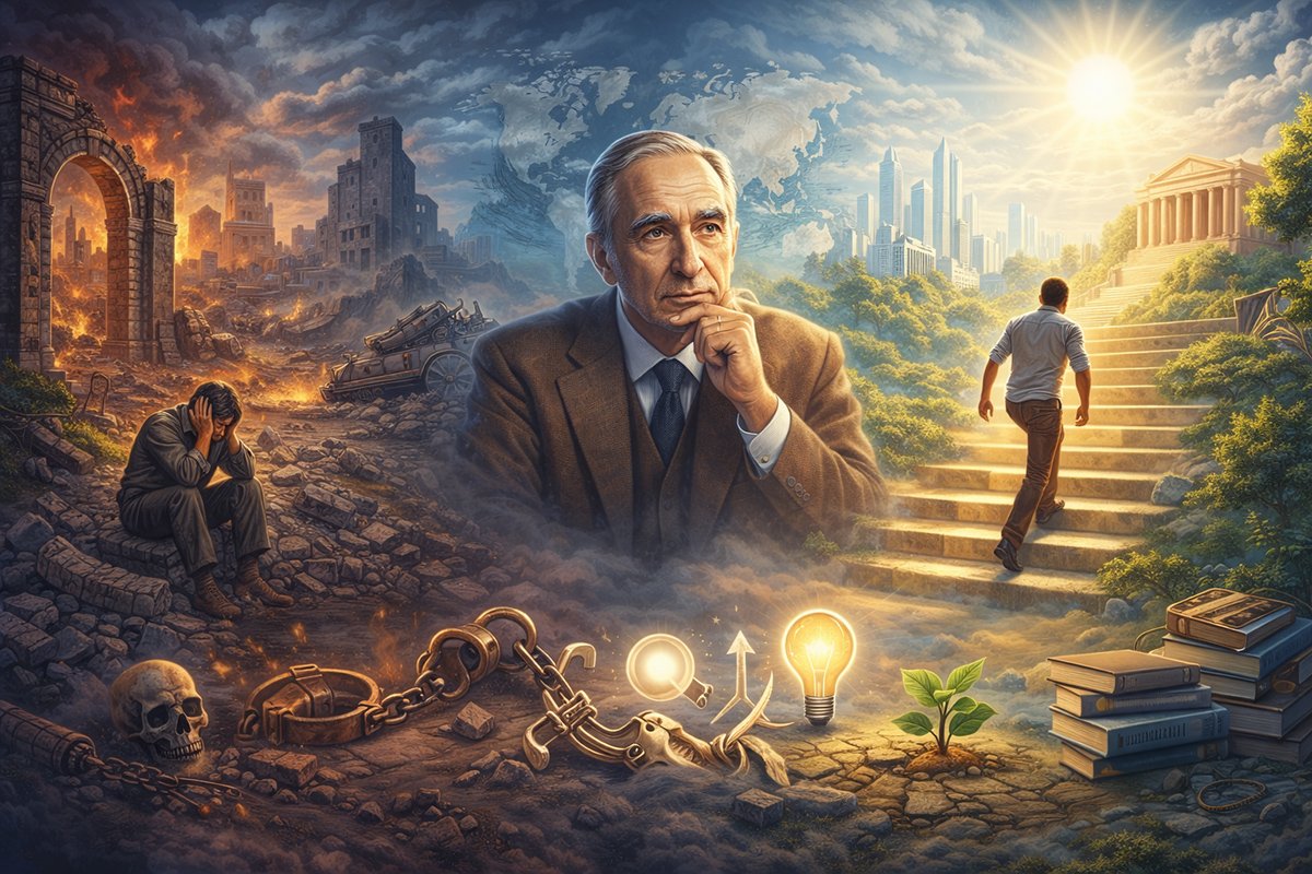 لا يكتفي توينبي بتشخيص الداء، بل يقدم رؤية فلسفية وعملية متكاملة للسبل التي تمكن الأمم من تجاوز كبواتها والنهوض من جديد لبناء حضارة مزدهرة تتلافى أخطاء الماضي.